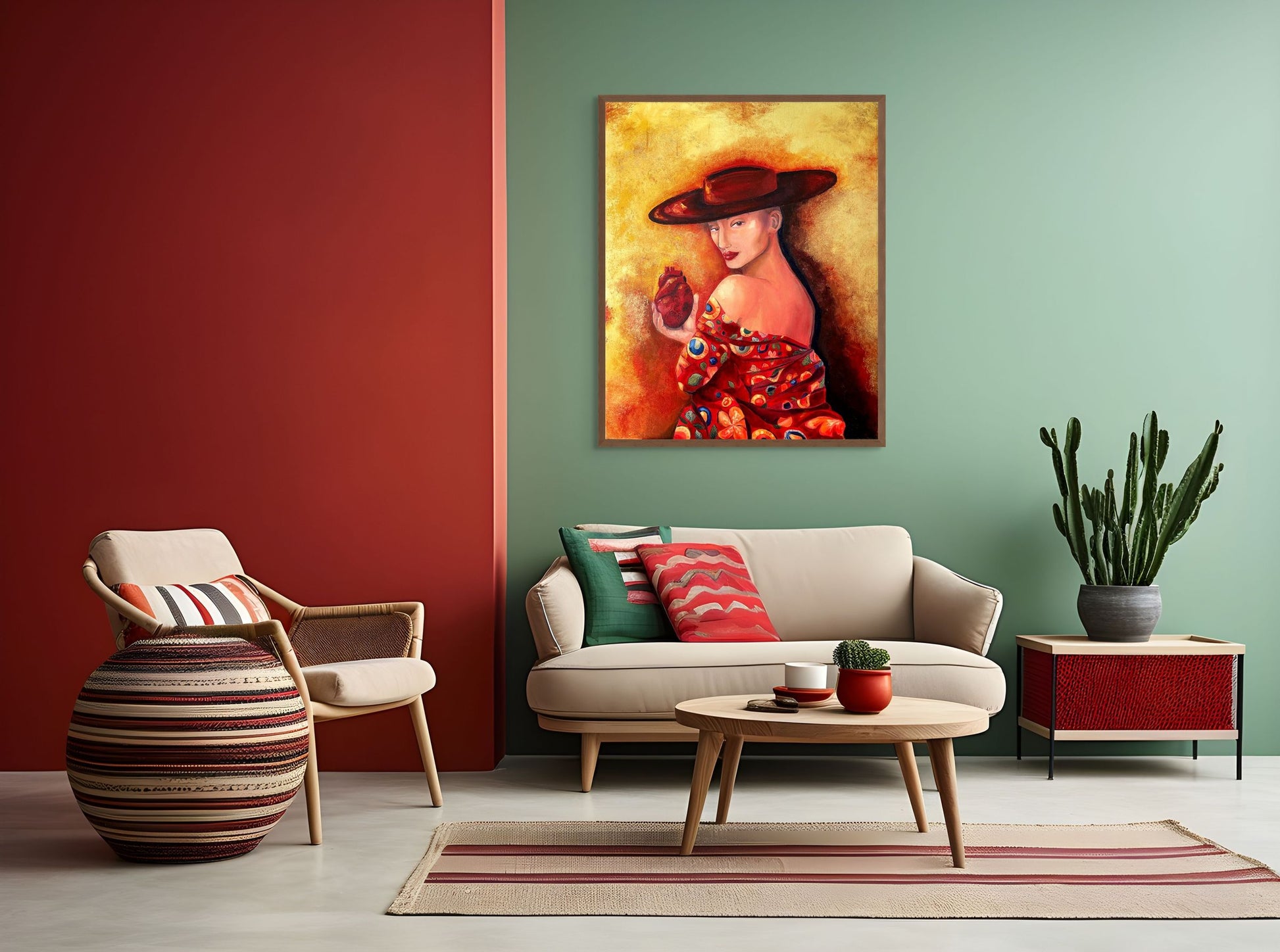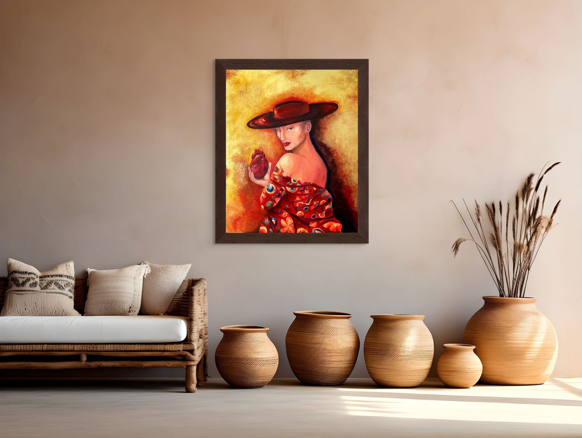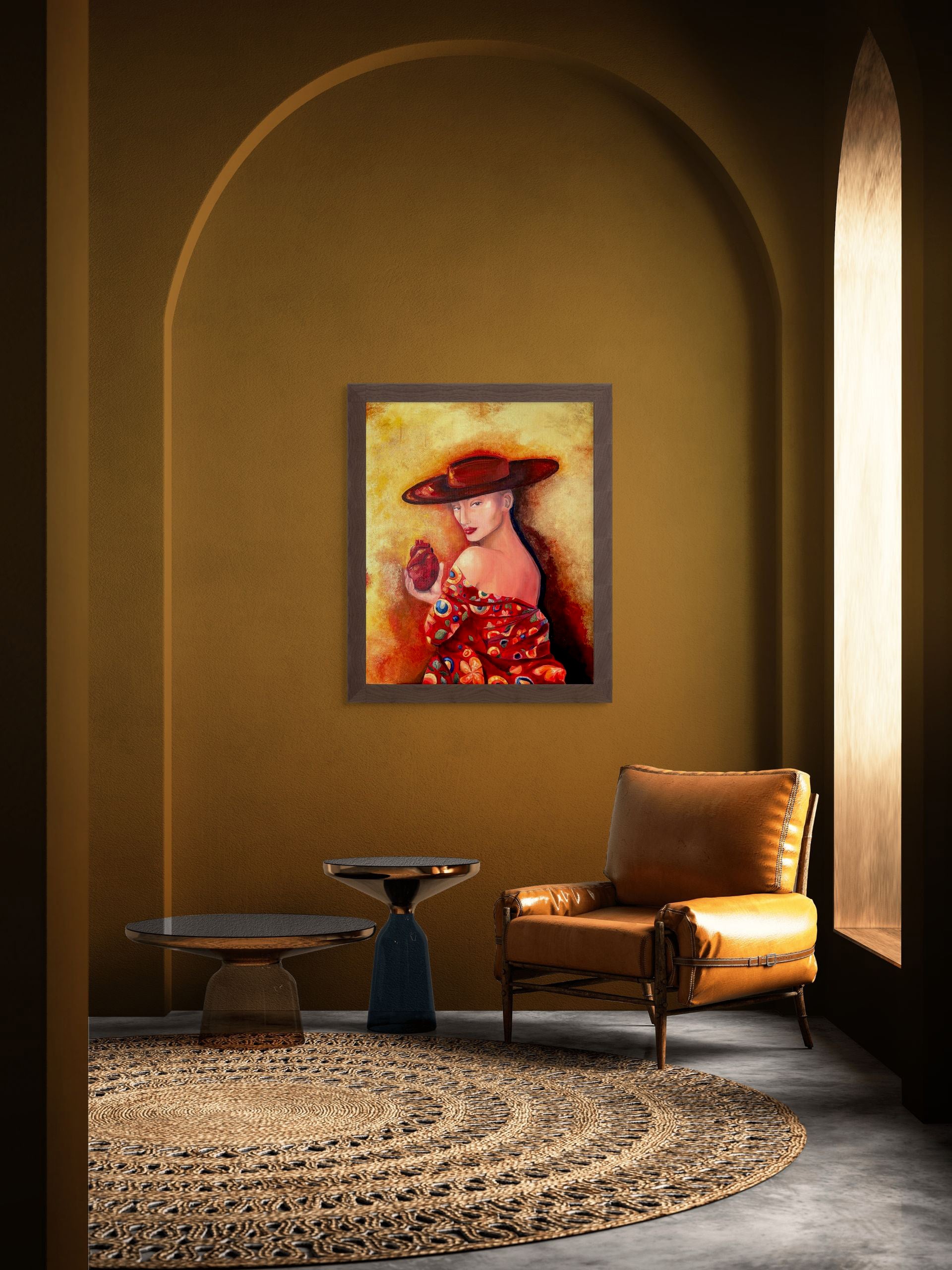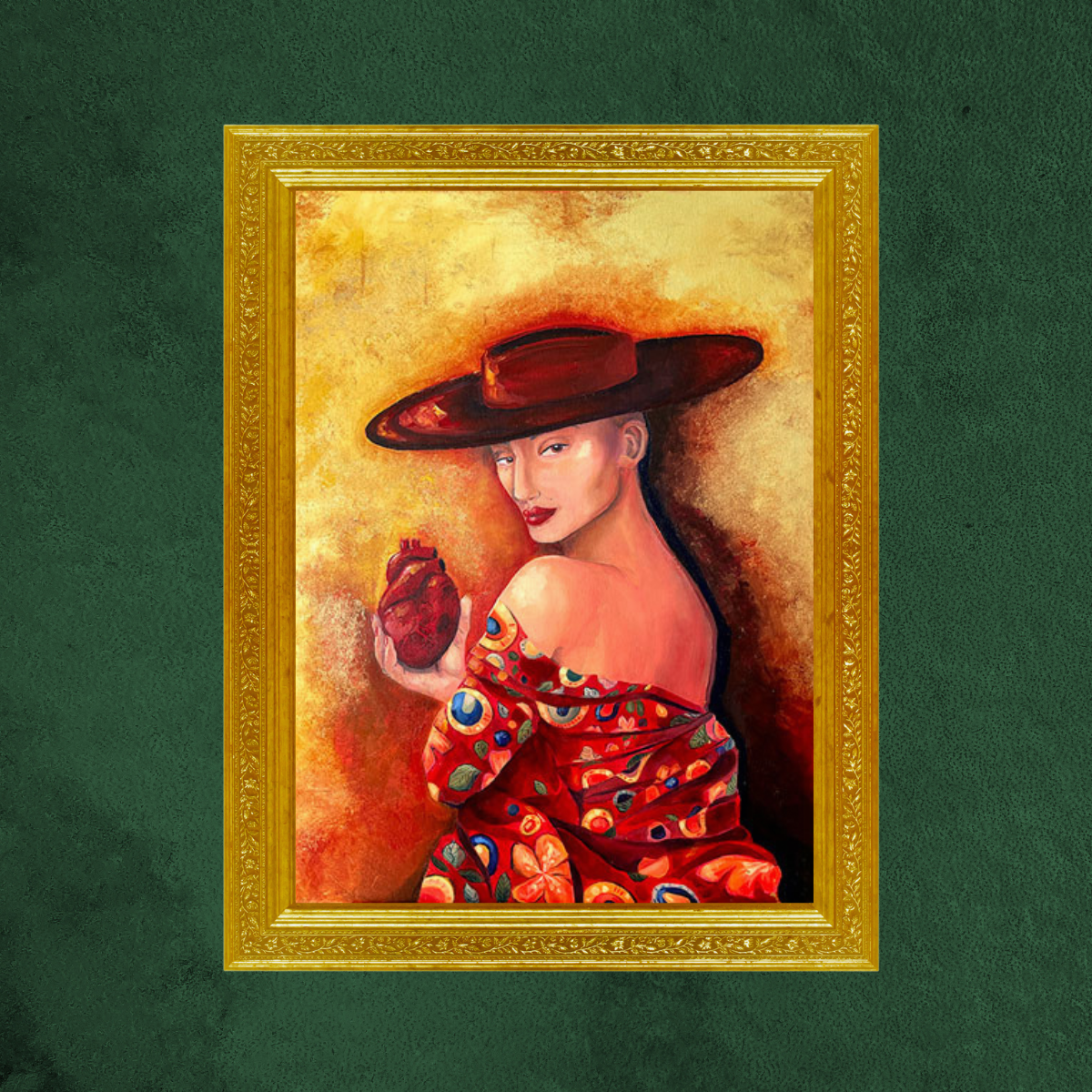 Inspired by Byzantine and Art Nouveau compositions, colours, and gilded details, this evocative piece portrays an elegant woman in a hat with striking red lips, delicately holding a human heart.