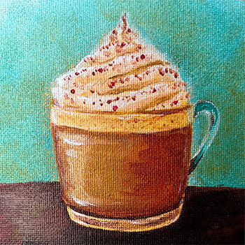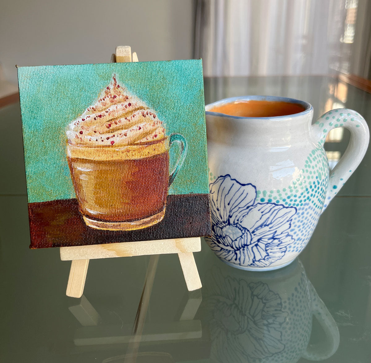 This tiny painting is inspired by the well-loved (and I supposed well-hated by some, but who cares?) - pumpkin spice latte. A signature drink of the season that signals the magic of the seasons changing.