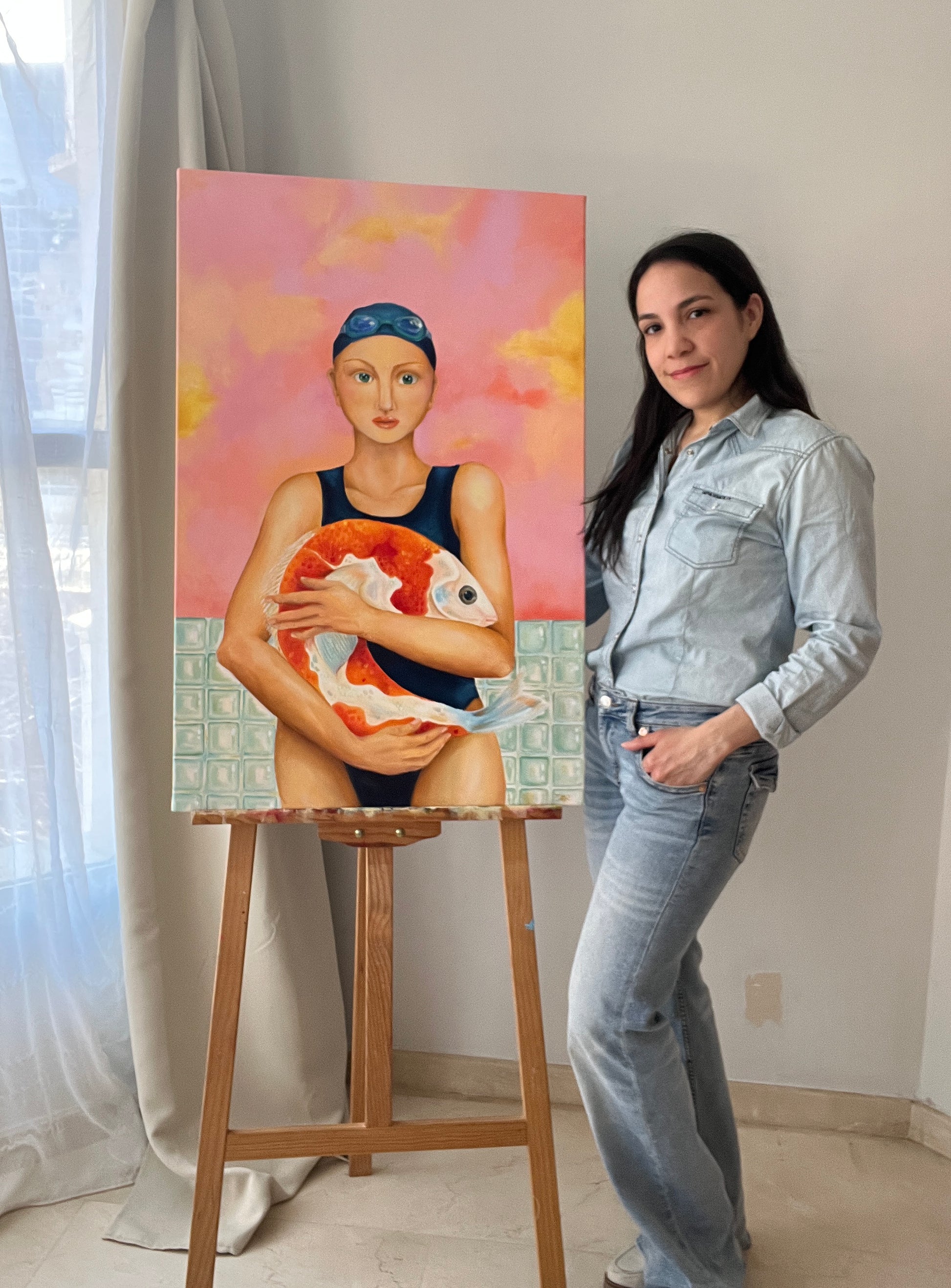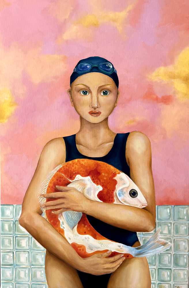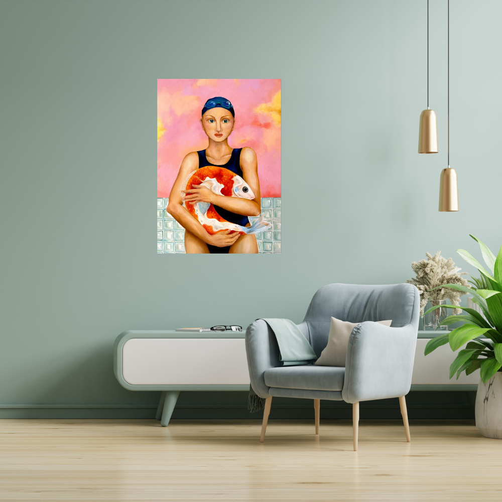 Inspired by surrealism, and the intersection of different world, this curious and fun painting showcases a woman holding a Koi fish in front of a glass surface.
